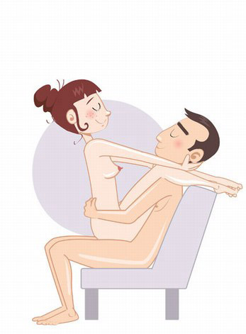 男生坐在凳子上面,面对面抱着女生坐在你的大腿,此时男根已经插入女性的阴道,然后让女生的上半身向后翻仰,男生托住女人的双肩来回律动抽插。这个做爱姿势貌似要求也颇高,要求你们具有较好的灵活性哦。